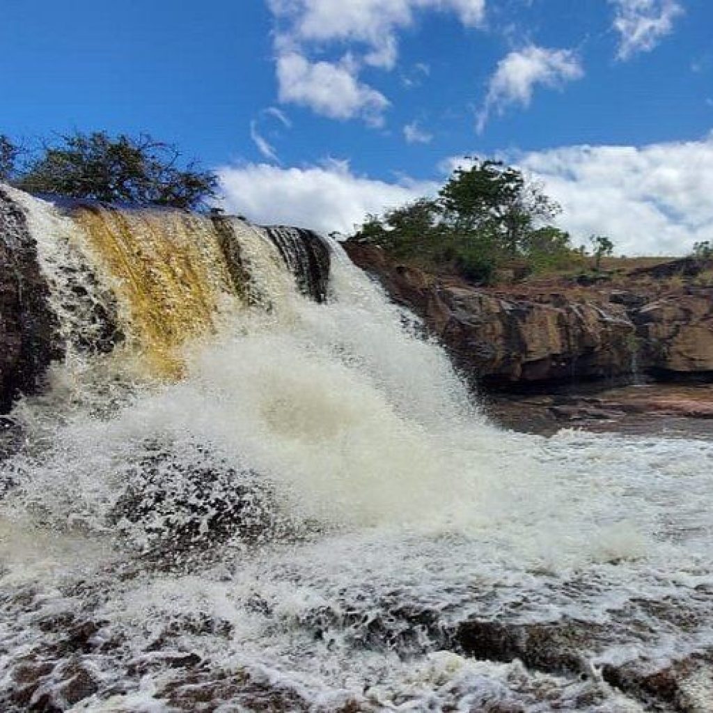 A scenic waterfall on the Ireng River, known for its natural beauty.
